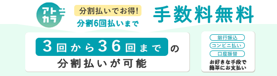 アトカラは、GMOペイメントサービス株式会社と三井住友カード株式会社が共同で提供する、ご利用の翌月にまとめてお支払いいただける決済サービスです。また、最大36回まで分割払いが可能で、6回までは分割手数料が無料となります。